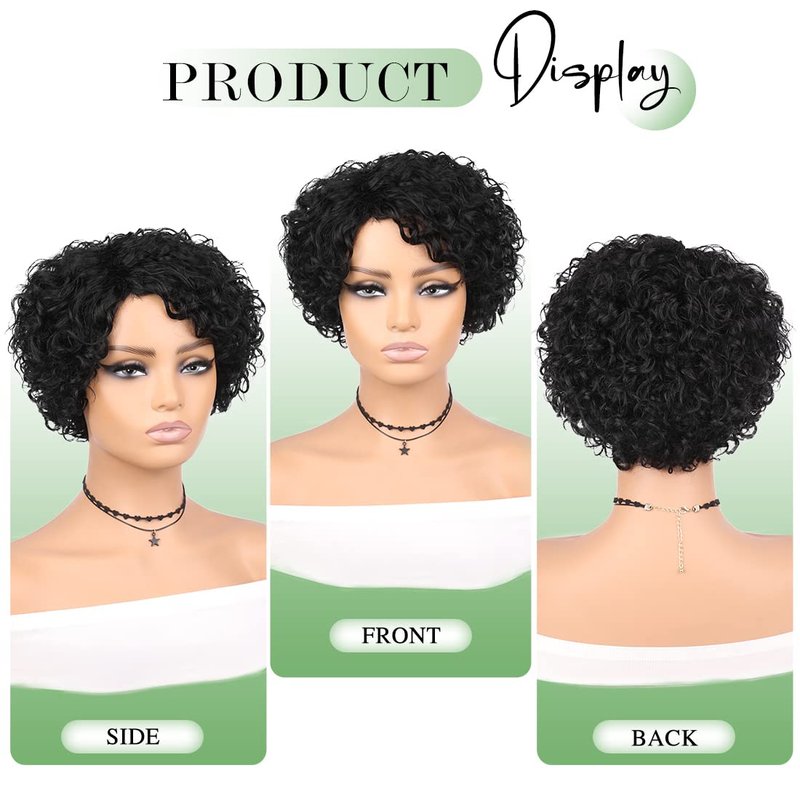Fancy Hair Short Curly Human Hair Wigs For Black Women Side Part Pixie Cut Kinky Curly Wig Natural Black Deep Curly No Lace Front Brazilian Remy Human Hair Wig for Women Daily Use