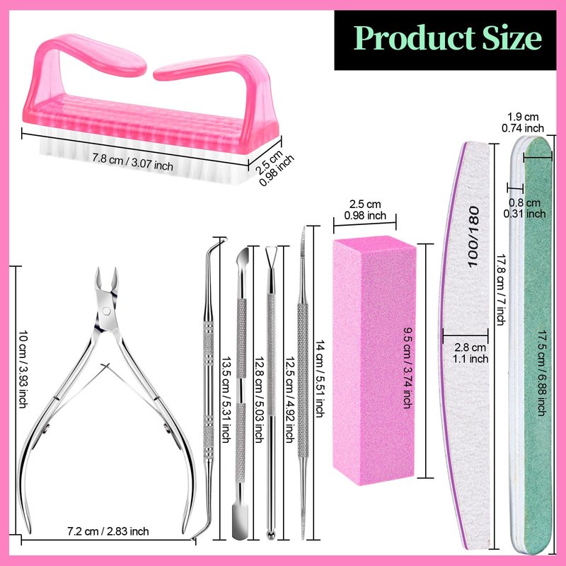 - Professional Manicure And Pedicure Kit: What you will get: 3 x nail files 100/180, 2 x polishing files, 1 x pink nail buffer block, 1 x nail cuticle nippers, 1 x nail pusher, 1 x triangular cuticle peeler, 1 x stainless steel toenail file, 1 x nail lifter for ingrown toenail, 1 x pink nail brush