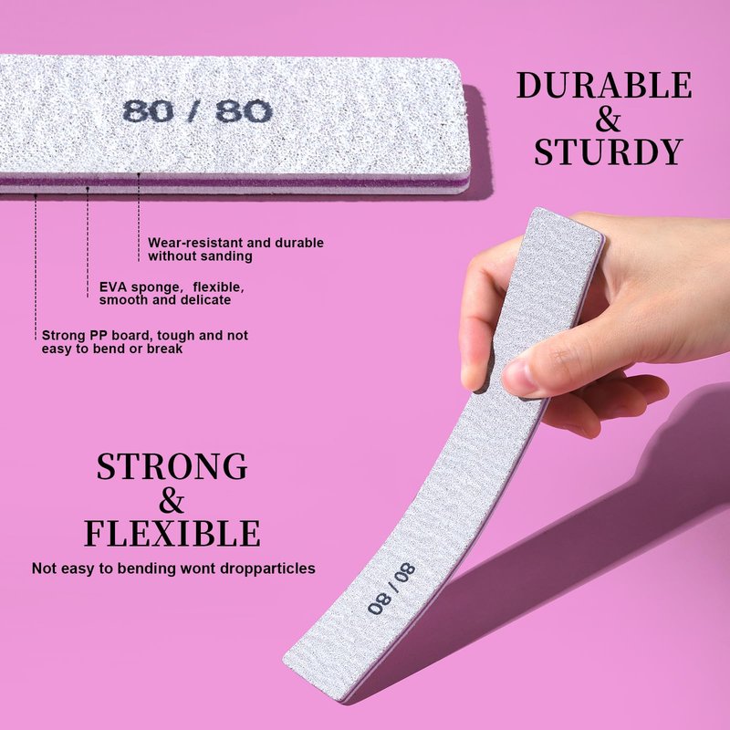 - High Quality Nail Files: Made of premium emery board materials, wear-resistant and without sanding. Strong PP board material, tough and not easy to bend or break. EVA sponge, flexible,smooth and delicate. Double-sided waterproof adhesive, quickly dry and the sand surface will not wrinkle, can be reused many times. Strong and flexible.