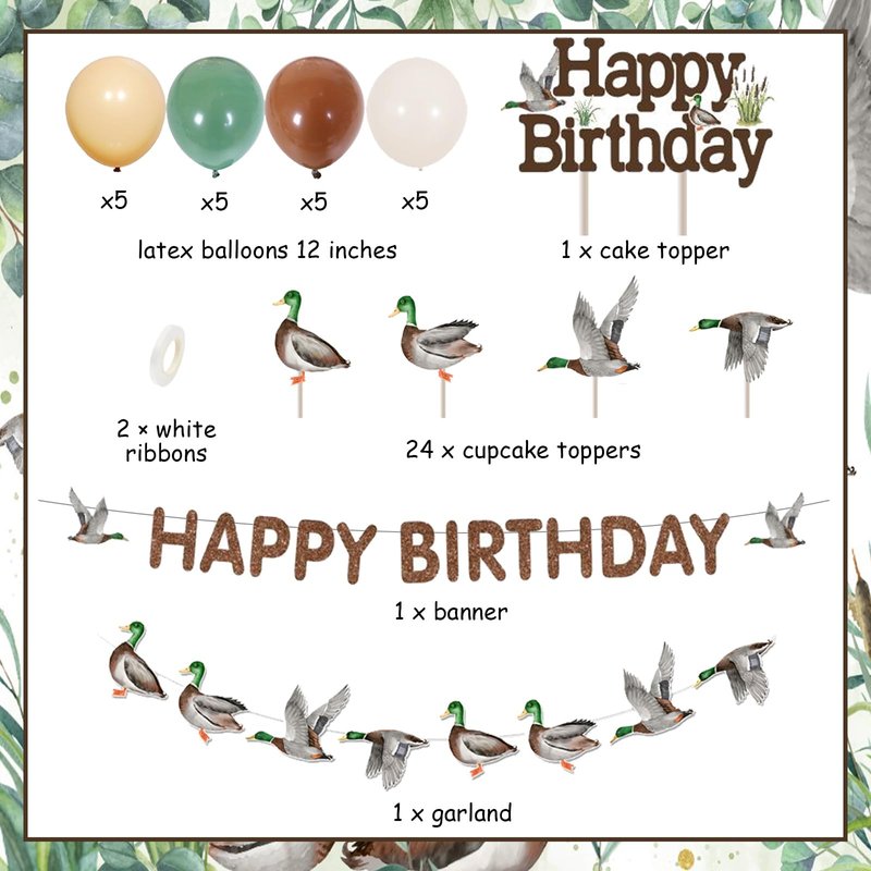 Package Includes: 20 x latex balloons 12 inches(5 sage green, 5 white, 5 brown and 5 apricot) 1 x “HAPPY BIRTHDAY” banner 1 x “Happy Birthday” cake topper 1 x mallard duck garland 24 x mallard duck cupcake toppers 2 x white ribbons 33ft