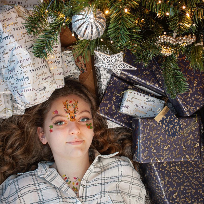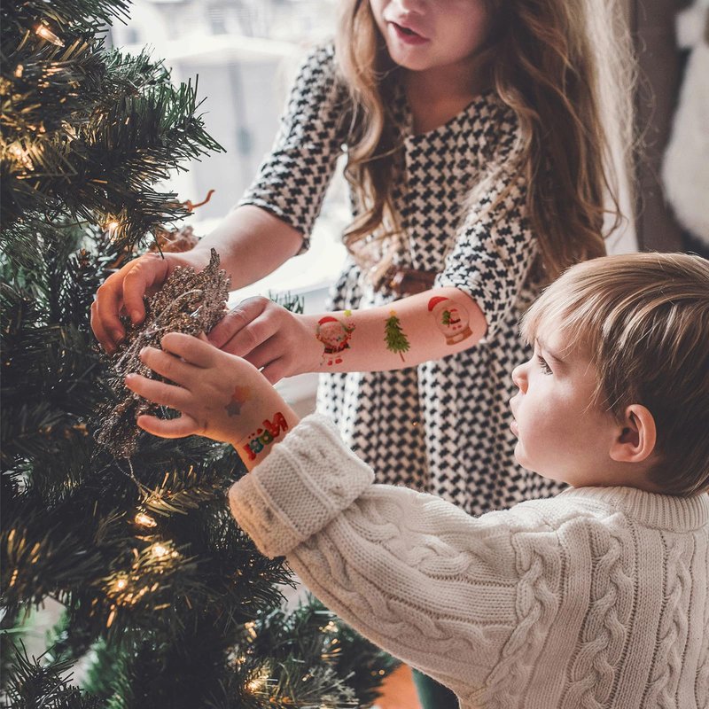 - Glitter Christmas Tattoos for Kids: Ho! Ho! Ho! Christmas is coming, just enjoy your Christmas holiday and have fun with your little ones with these cute tattoos. Tens of perfect-kid sized tattoos that glitter with classic Xmas elements such as Santa Claus, snowman, reindeer, Christmas tree, stocking, decorations.
