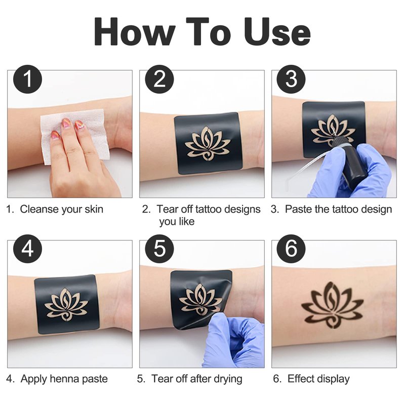 - ⯁Easy To Use: Clean your skin, choose your favorite tattoo design, stick the tattoo template on your body parts. Apply henna paste, or maybe glitter powder too. Wait for it to dry, tear off the tattoo template after drying, and you can see the effect of the tattoo.