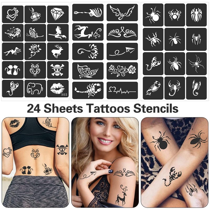 - ⯁Henna Tattoo Kit: 24 Sheets tattoo stencils, including 400 different tattoo designs. There are small tattoo designs, medium size tattoo designs, and big tattoo designs. Meet your different choices! Tattoo stencils for real tattoos beginner.