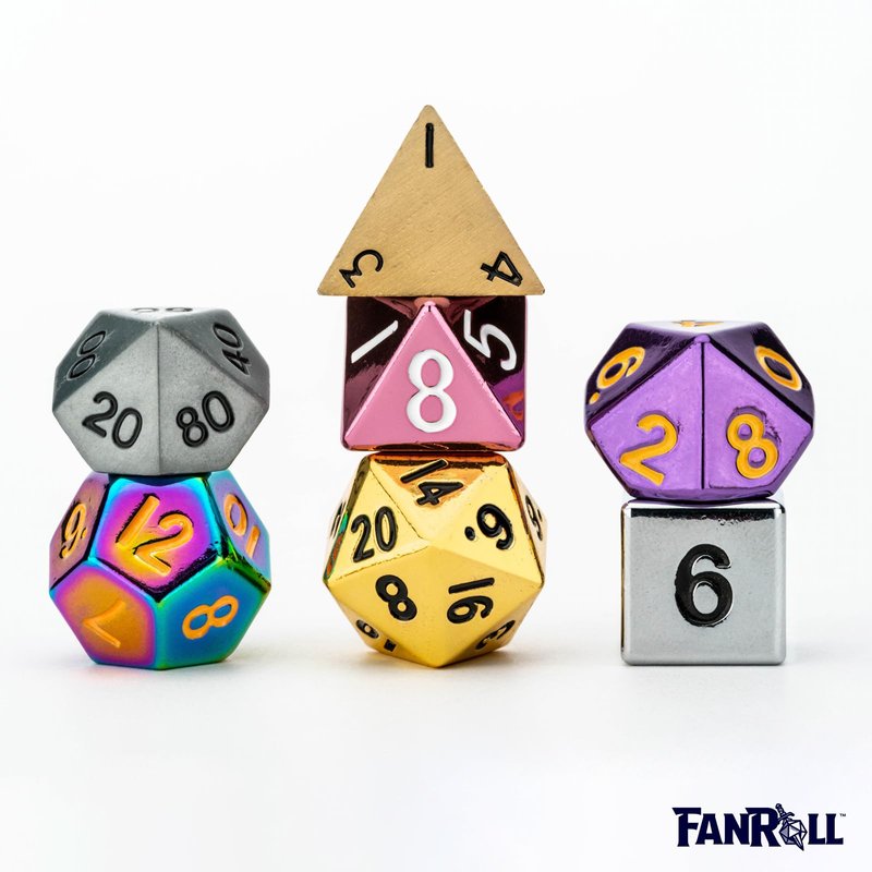 - Every pack comes with a full set of 7 metal dice including D4, D6, D8 D10, D%, D12 and D20.
