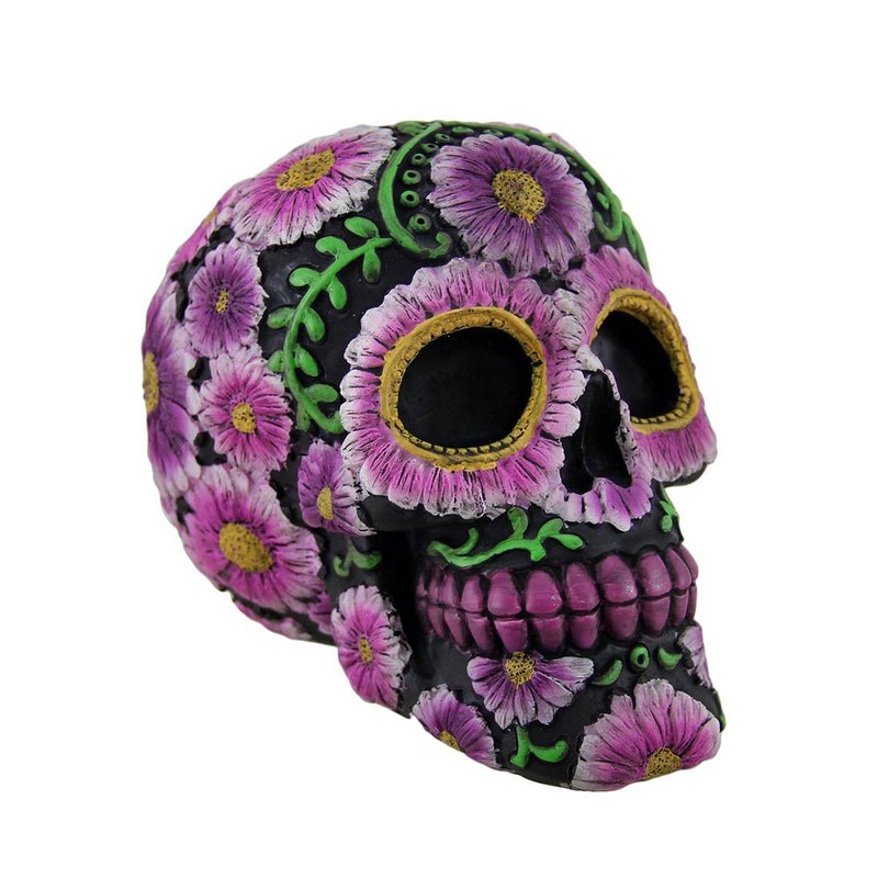This floral sugar skull coin bank makes saving money fun and easy, and is a festive addition to shelves, desks, or bookcases in your home. This 5.25 inch long, 4.25 inch high, 3.75 inch wide (13x11x10 cm) sugar skull is creatively cast in resin and hand painted in a vibrant black, pink and purple finish, making each piece a lovely addition to any skull or coin bank collection. The bank easily empties via a rubber plug on the bottom. It's great as a gift any sugar skull lover is sure to enjoy!
