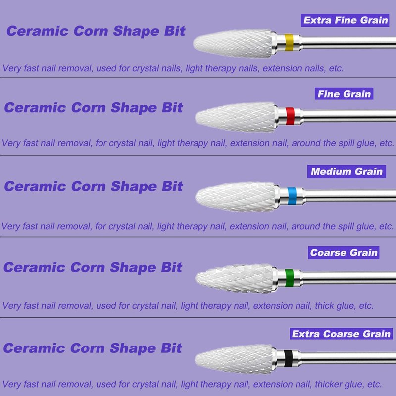 - 【Professional Nail Drill Bit Set】Fantexy corn shape nail drill bits set contains 1pcs Extra Fine bit & 1pcs Fine bit & 1pcs Medium bit & 1pcs Coarse bit & 1pcs Extra Coarse bit.Ideal for professional nail technicians or nail art beginners.