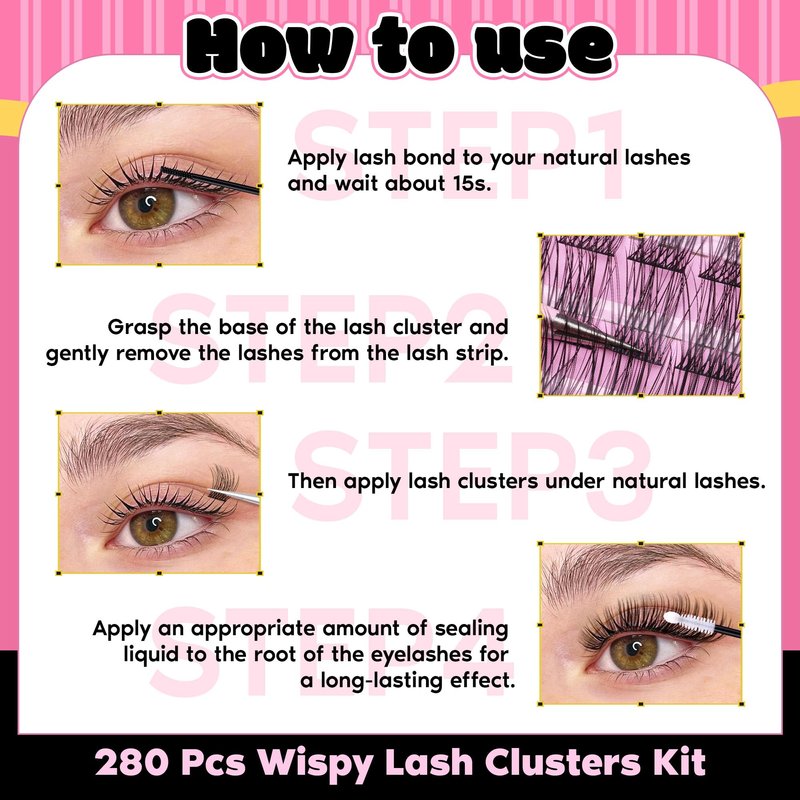 - This cost-effective diy lash extension kit includes all the accessories needed to wear an eyelash clusters, including 168 pcs cluster lashes, 4 different lengths of natural wispy lash cluster, an lash bond and seal, and an eyelash tweezers