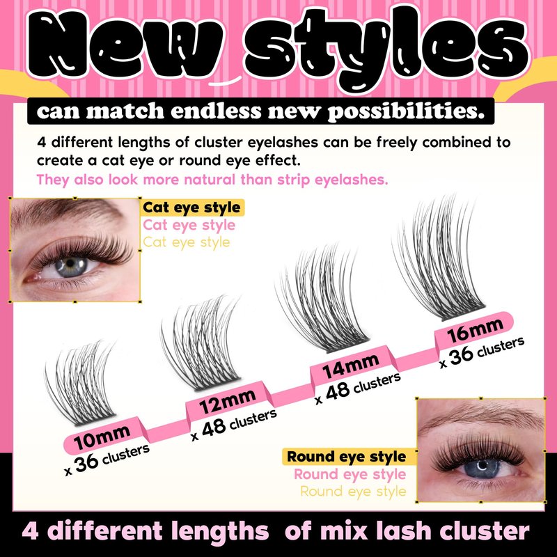 - The lash cluster is has into 4 lengths: 10-16 mm, slightly different in length; You can choose according to your own needs and choose different eyelash clusters for different occasions