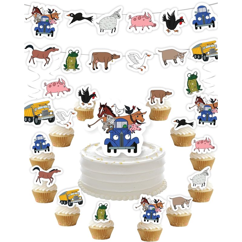 - ๐ฎ Quick & Easy Party Decorations โ Enjoy 10 foot farm animal banner, matching cake topper, 24 cupcake toppers, and 4 hanging swirls in blue truck theme. Your little boy or girl will be so excited to see these adorable farm animals in all their birthday glory!