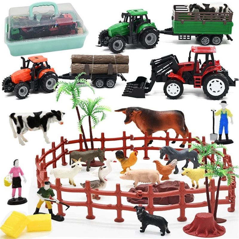 - FARM ANIMALS TOYS: Farm playset with 3 transport farm tractor, 12 farm figurines, 3 farmer people figures, 10 fence, 3 wood, 2 bales of hay, 2 tree, 1 stones, 1 tree trunk 1 storage case. your children can spend long hours exploring and building the farm animals world.