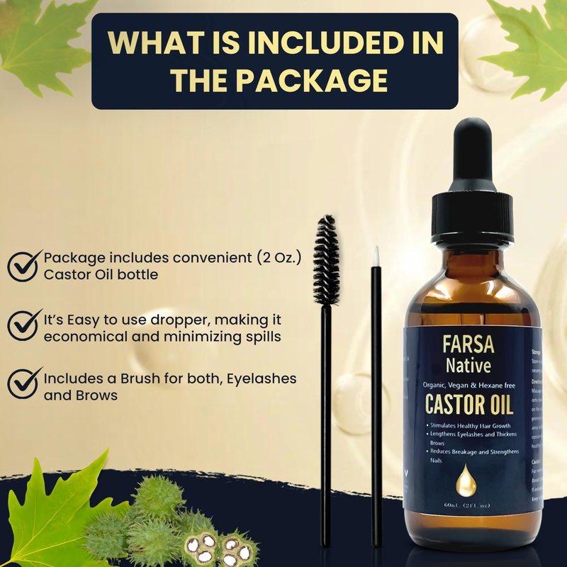 - ✅Discover the benefits of FARSA Native Organic, Vegan Castor Oil: Our 100% Pure, Organic and hexane free Castor Oil – Our Castor Oil is sourced from premium castor beans, ensuring the highest quality and purity. Elevate your gaze with 100 pure Castor Oil in a convenient (2 Oz.) bottle, featuring an easy-to-use dropper, making it economical and minimizing spills, moreover, allowing you to apply drops seamlessly on lashes and nails and includes a Brush for both, Eyelashes and Brows.