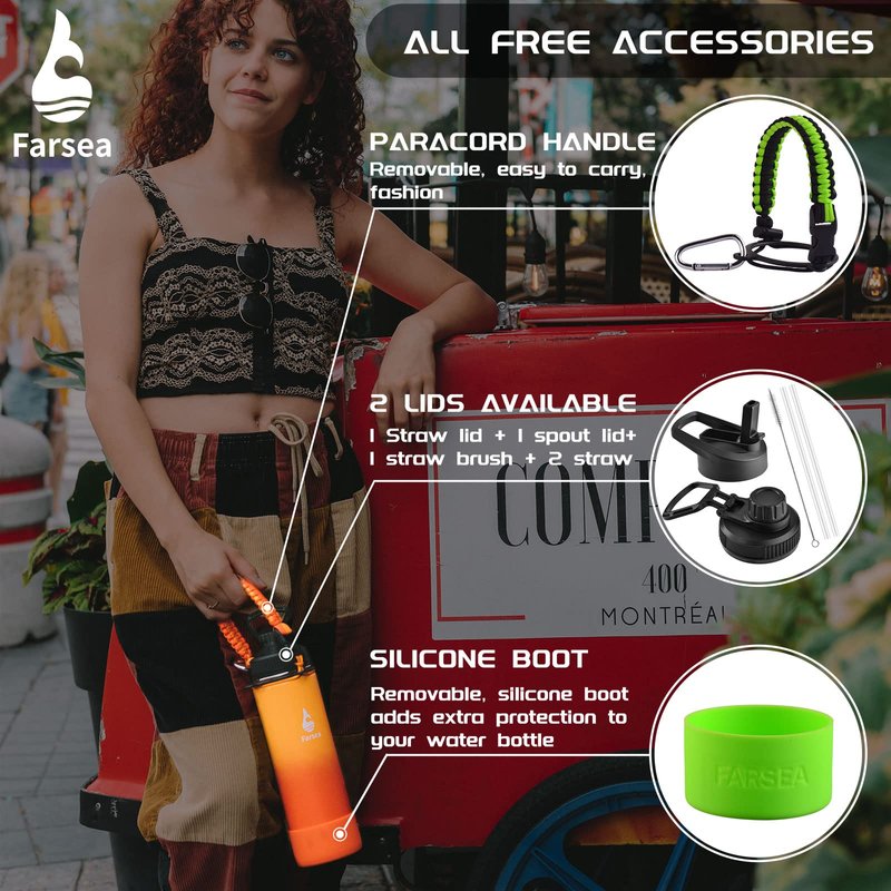 - 100% SATISFACTION GUARANTEE: Farsea is committed to providing the best value and highest quality to the customers. Our after-sale team will offer superior service to solve all problems. If any reason, you are not100% satisfied with the insulated bottle, we will issue you a full refund or an exchange! Package: Comes with 2 lids (Straw lid & Spout Lid), 1 * paracord holder,1*protective Silicone Boot,1 * nice packing box,2*straws, and 1* straw brush.