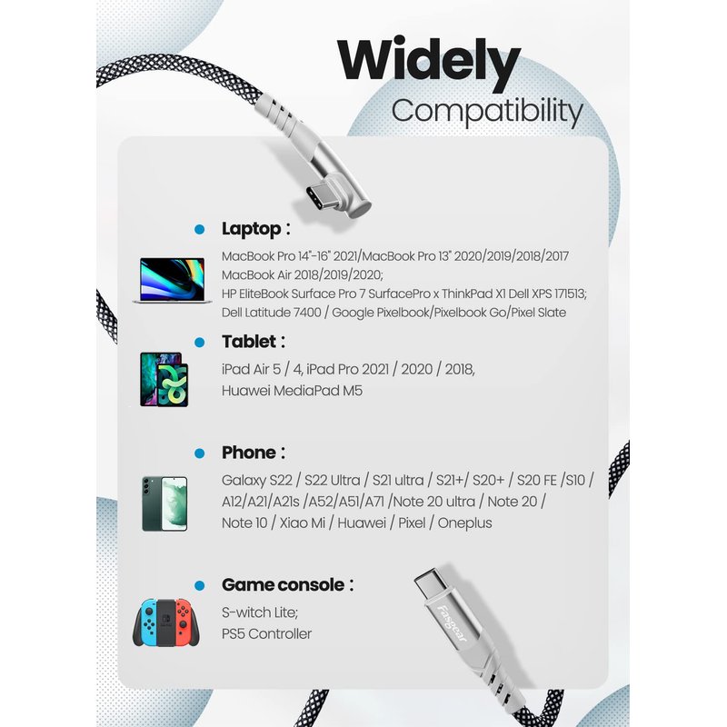 - 【Compatibility】- Fasgear 100W USB C to USB C charging cable is compaitble with iPhone 15/15 Plus, M2/M1 Mac-Book Pro/Air, iPad Pro 2022, iPad Air 4, iPad Mini 6, Sam-sung Galaxy S24/S24+/S24 Ultra/S22/S21 Ultra/S20/S20 Plus/S10, Google Pixel 6/6 Pro/5/5a/4a, Pixelbook, Chromebook Pro, Nin-tendo Switch Host, PS5, LG and other newly launched USB-C smartphones, Quest 2, tablets, gaming devices, and other USB-C devices.【Note】Can not transfer video signal from laptop to monitor/monitor to monitor.