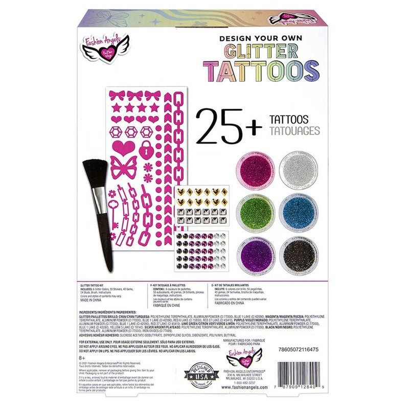 8+. 25+ tattoos. 119 cosmetic adhesives. 6 glitter colors. Includes: 6 glitter colors, 55 stickers, 40 gems, 24 studs, brush, instructions. Find your wings. Design your own glitter tattoos. Colors and styles of contents may vary. www.fashionangels.com. Made in China. Designed in the USA Milwaukee, WI.