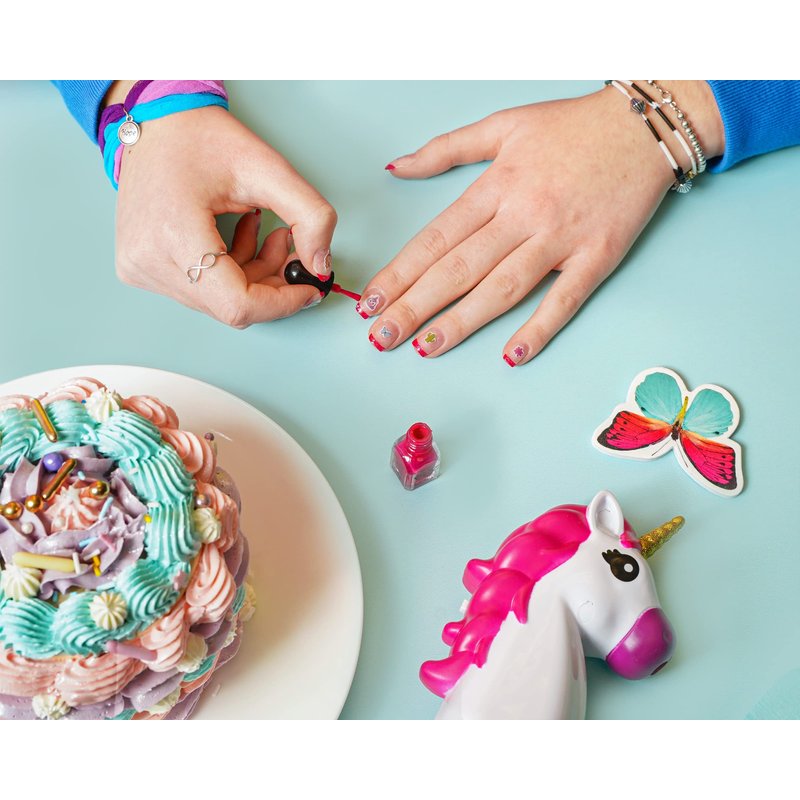 - WHAT'S INCLUDED - Set includes includes 2 bottles of water based nail polish, 1 pod of nail glitter, 1 nail file, and 1 battery operated unicorn nail dryer. Designed in the United States. Recommended for children ages 8 and up