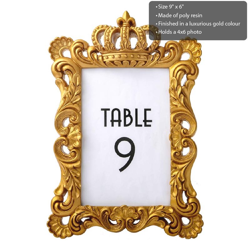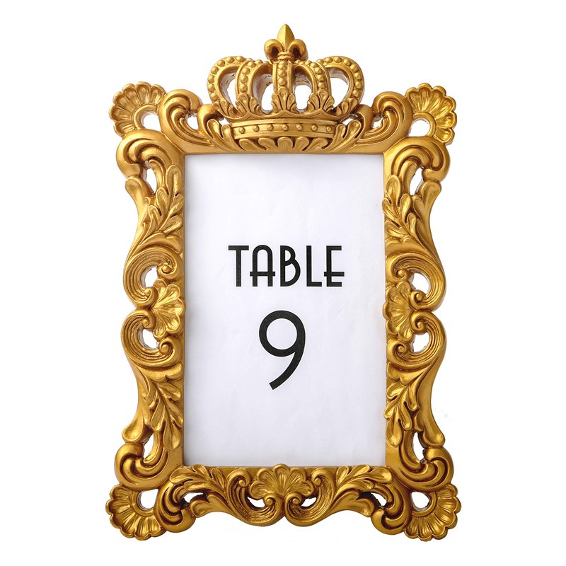 Add a right royal finish to your event with these magnificent ornate gold crown frames. They can be used to indicate table numbers and seating arrangements. After your event, guests can take them home to display a photo of your special day!