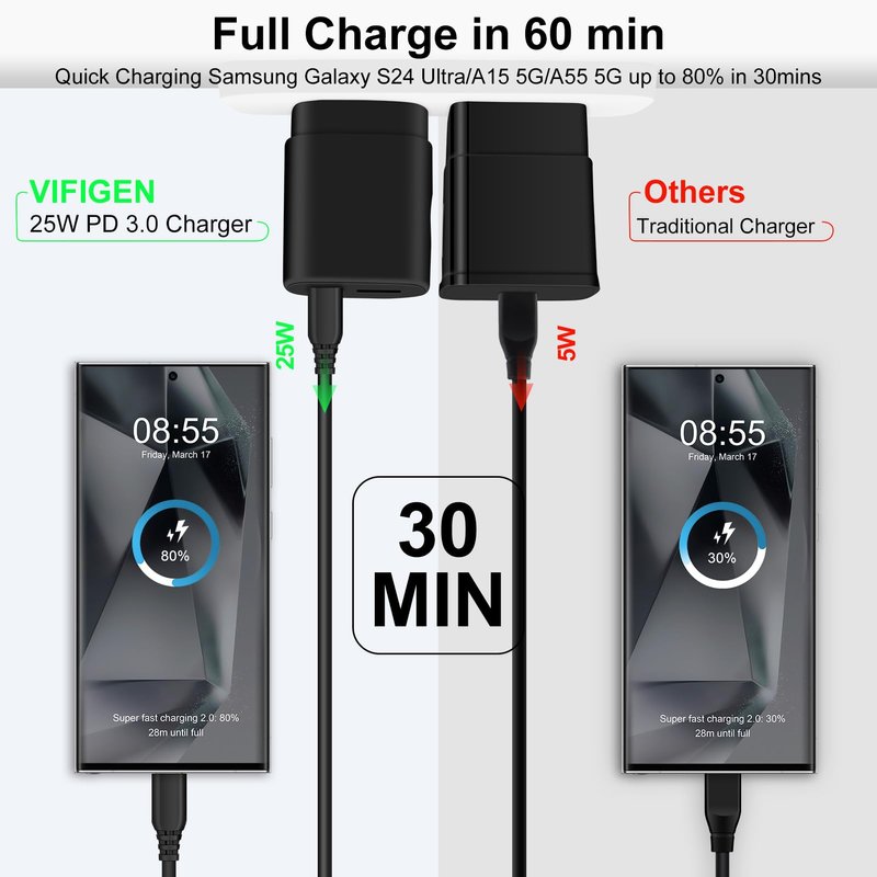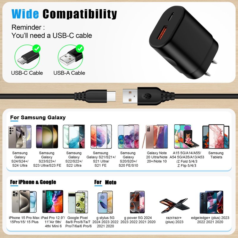 - 【C Type Fast Charger Block】PD 25W fast charger and 6ft usb c to usb c fast charging cable compatible with Motorola Edge 2024/Edge 2023,razr plus 2024/razr 2024/razr 2023,Moto G Stylus 5G 2024 2023,Edge 50/Edge 50 Ultra/Edge 50 Fusion/Edge 50 Pro,G Power 2024/G Play/G Pure,Razr 50 ultra,Razr 50,Razr+; Samsung Galaxy S24 Ultra S24+ A15 5G A14 5G A54 A55 A35 A13 A25 S23 FE S23 Ultra S23+,A23 A53 A03s,Z Flip 6 5,Z Fold 6 5,S22 S21 FE S20 S10 S9 S8; iPhone 15;Google Pixel 8a 8 Pro 8 7a 7 6.