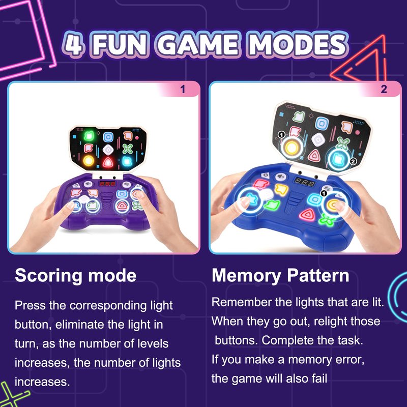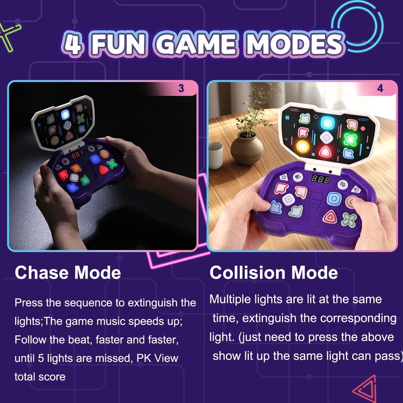 - Four Exciting Modes With Over 999 Levels: Enjoy Endless Fun With Four Thrilling Game Modes—Score Mode, Memory Mode, Chase Mode, And Collision Mode, LED Level Display. As You Advance Through The Levels, The Number Of Lights Increases, The Time Limit Decreases, And The Music Tempo Accelerates, Providing A Progressively Challenging Experience Suitable For Both Kids And Adults.
