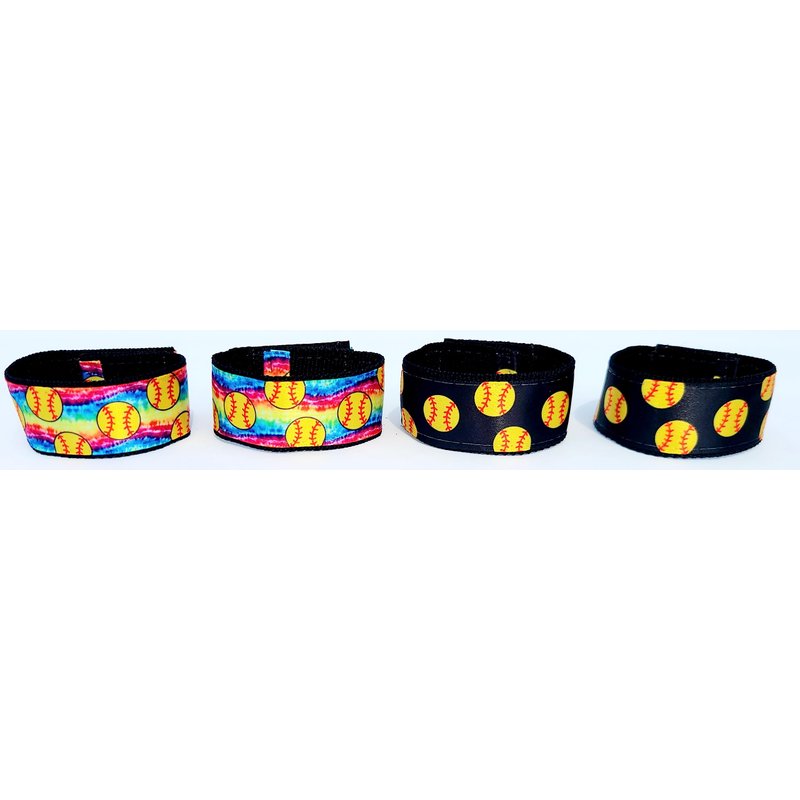 Fastpitch softball sleeve scrunchies combo pack *2 pair, 4 pieces) black with yellow balls and tie dye from the ORIGINAL USA inventor. Softball sleeve holders, sleeve straps, sleeve wraps. Over 8 million sold