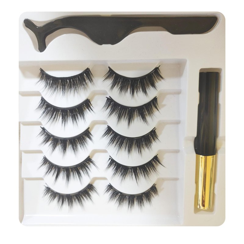 - False Eyelashes Set Contains: 5 pairs of magnetic natural false eyelashes, a tweezers and a false eyelash glue.