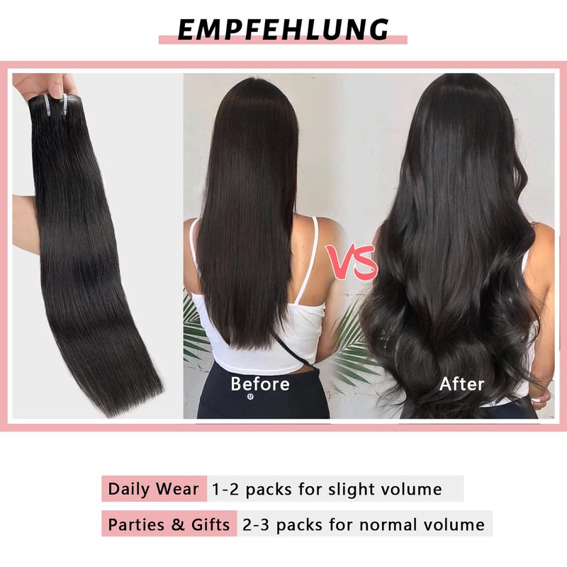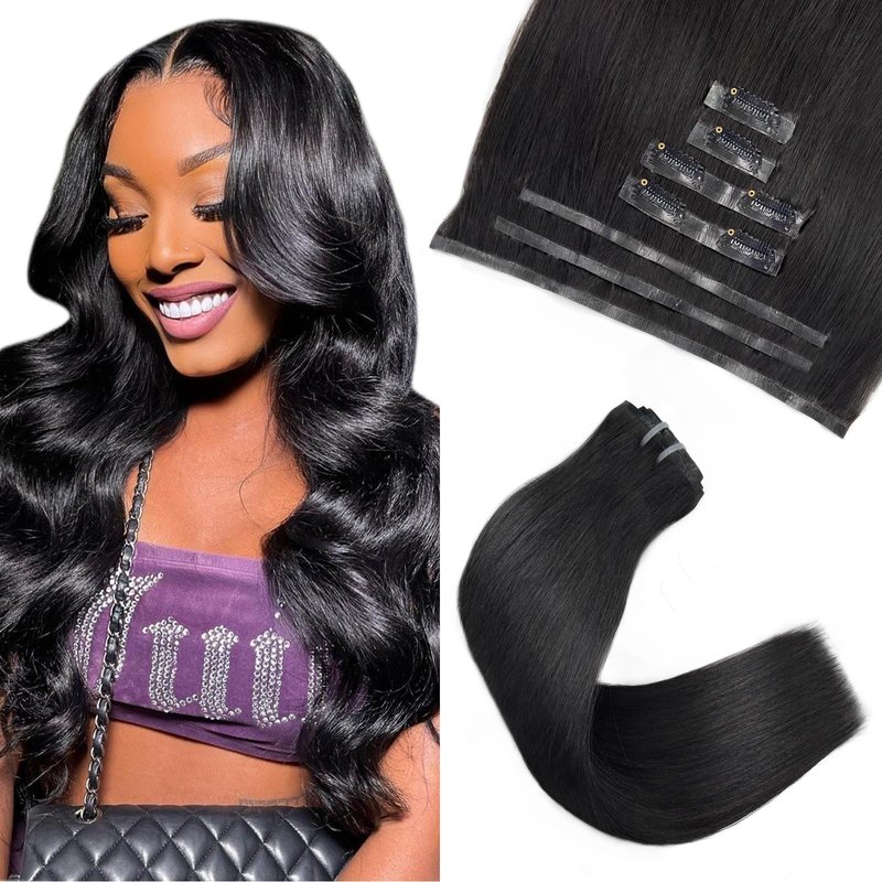 💈Our black seamless clip-in human hair extensions are made from high-quality 100% Remy human hair, which can be styled with heat tools, washed, and dyed to match your natural hair color. They have a seamless design that blends flawlessly with your hair, and are easy to apply and remove without damaging your natural hair. Our clip-in extensions are also versatile and can be cut and styled to create any hairstyle you desire.