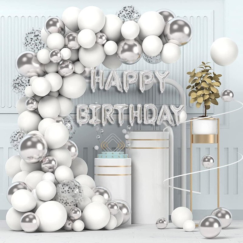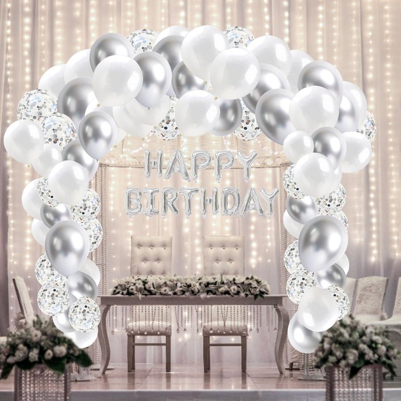- PARTY BALLOONS KIT:A pcs happy birthday balloons banner,white balloons 5 inch 20 pcs,10 inch 35 pcs,12 inch 15 pcs,confetti latex balloons 12 inch 10 pcs,silver balloons 5 inch 10 pcs,10 inch 10 pcs,12 inch 10 pcs,quantities meet your needs.