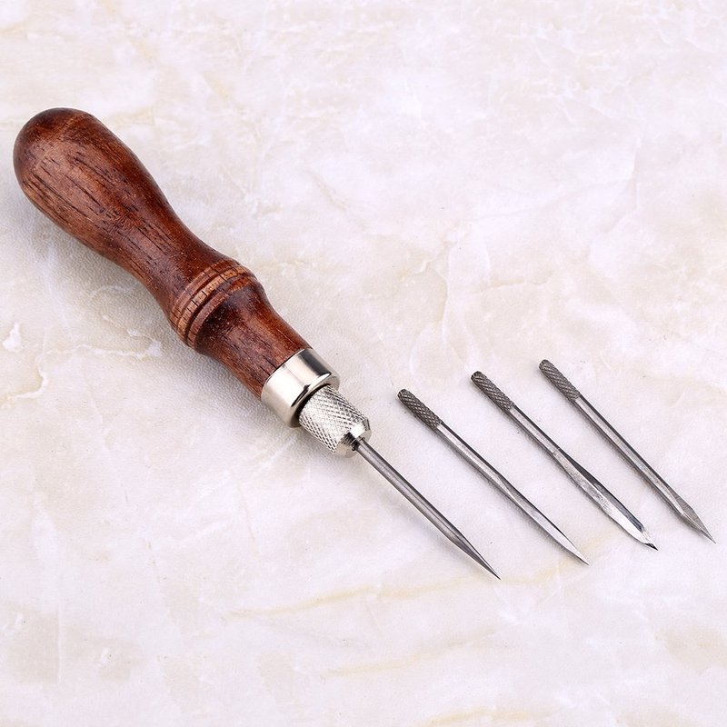 The stitching awl is a practical tool to punch holes in leather and make it easy to stitch. Including a wooden handle and 4 awl heads, flexible and handy to use.