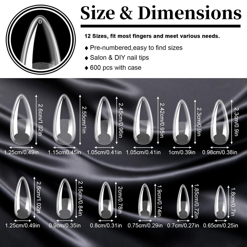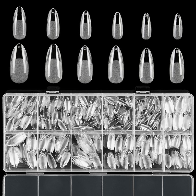 - Package Contents: Come with 600 almond nail tips. Provide you with sufficient quantity.You can make nail art at home easily. The gel nail tips come in 10 sizes, numbered 0-11 at the top of the tip, to ensure you find the almond press on nails ideally fit your finger