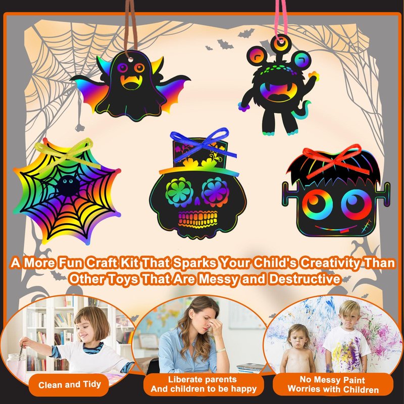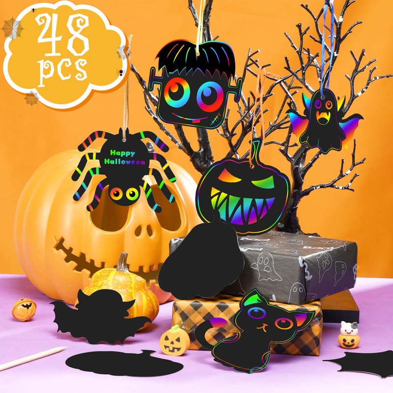 - Scratch Papers Craft Kits: The rainbow scratch paper kit consists of 48 Halloween scratch off paper cards (3.2 inches-5 inches, 12 different styles), 12 scratching tools (5.4 inches) and 48 colorful cords for hanging (8 inches) for a fun and creative Halloween party