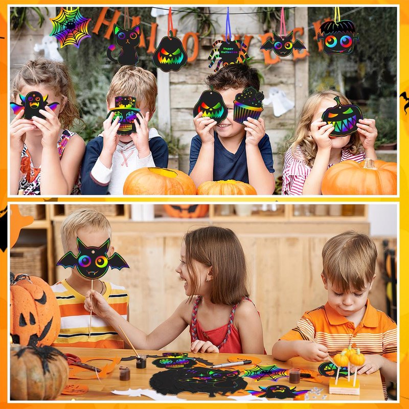- Halloween Party Favors: Magic rainbow scratch paper art is suitable for Halloween goodie bag fillers, Halloween party games, Halloween gifts, Halloween party supplies, haunted Halloween party, "trick-or-treating" toys, Halloween crafts, classroom prizes, and all other uses