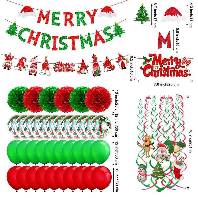 • Size: MERRY is 3ft ,CHRISTMAS card is 5ft;Santa Claus Banner is 5ft, paper Pom poms dia is 10";Swirl Streamers is 31";latex balloons is 12".
