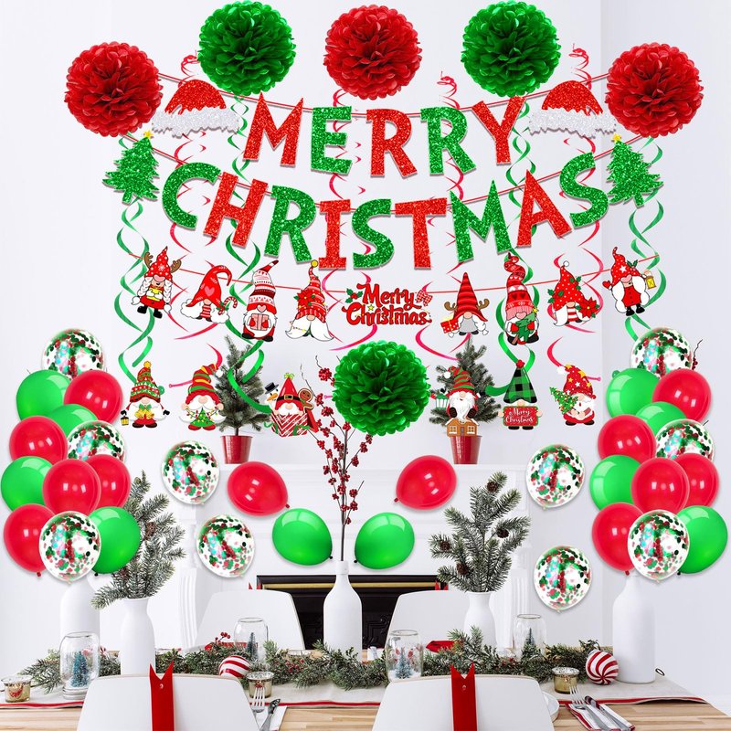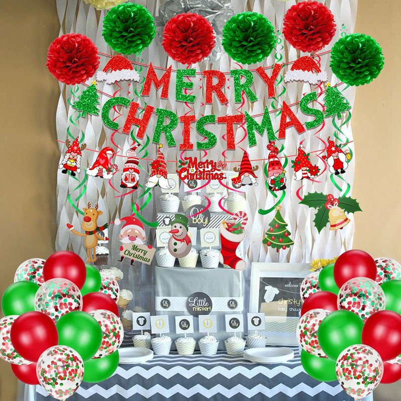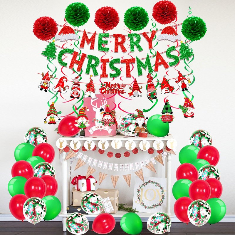 • Material:Eco-Friendly MERRY CHRISTMAS paper banner;Santa Claus Banner Pom poms is paper,Plastic Swirl Streamers,Latex Balloons.