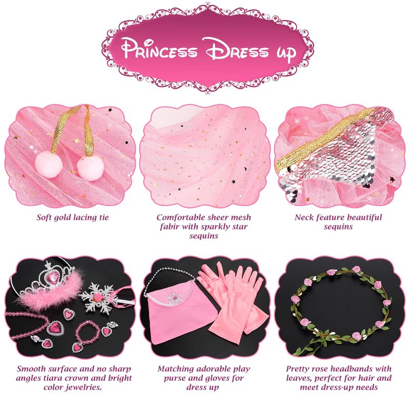 - Variety of Accessories for More Extra Fun: Fedio princess costume for girls has different colors of capes and variety of accessories match different princess characters. Stylish play purse, gorgeous princess crown,rose headband and other princess accessories, all these matching accessories jewelries offer extra elegant and luxury for toddler dress up.