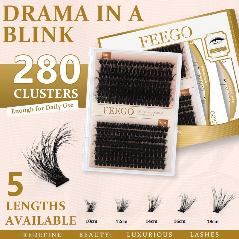 FEEGO Fluffy Eyelash Extensions Kit With Cluster Lashes, Applicator for Beginners, Individual Lashes, Lash Bond, Seal Glue, Remover (6080D Charming Kit)