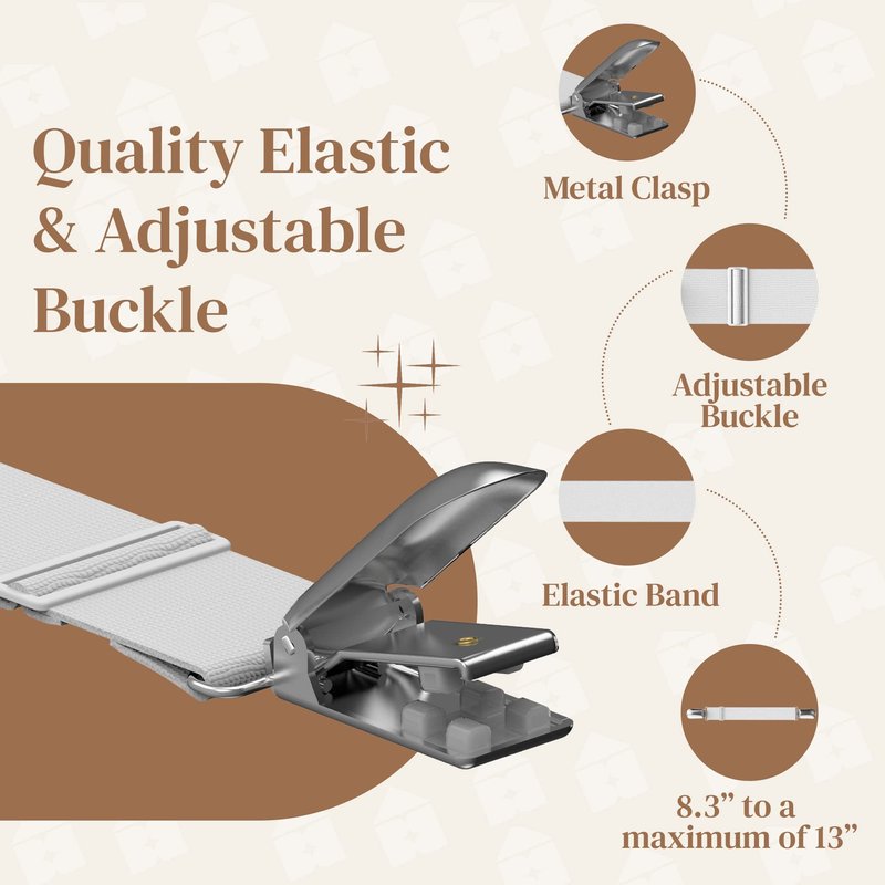 - 🔗ELASTIC BED SHEET STRAPS - Made of high quality 1” wide elastic band and clips to fit all types of bed sheets, bottom sheet, fitted sheets, flat sheets, mattress pads etc. The strong elastic strap provides a secure and strong grip. No more loose sheets in the morning!