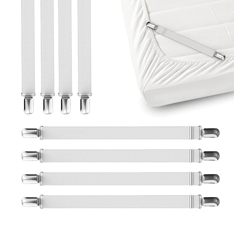 FeelAtHome 8 PCS Bed Sheet Clips Keep Bedsheets in Place-Corner Bands Suspenders for Fitted Sheets - Mattress Sheets Grippers Holders Straps Fits from Twin Queen King Garters Fasteners Clamps (White)