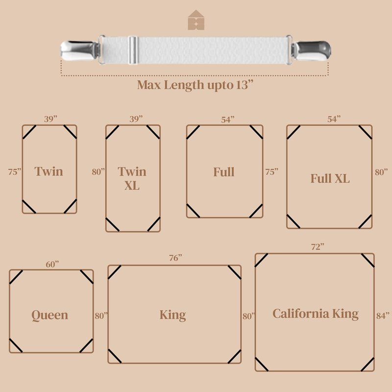 - 🛏️FITS ALL KINDS OF SHEET SIZES - The bed sheet holder will be able to fit all range of mattress sheet sizes including: Twin, Twin XL, Full, Full XL, Queen, King & even up to California King sheets. (See Our Mattress Size Chart for reference). Designed for the best, this handy bed sheet suspender work well with all types of bedding mattresses, adjustable beds and more!