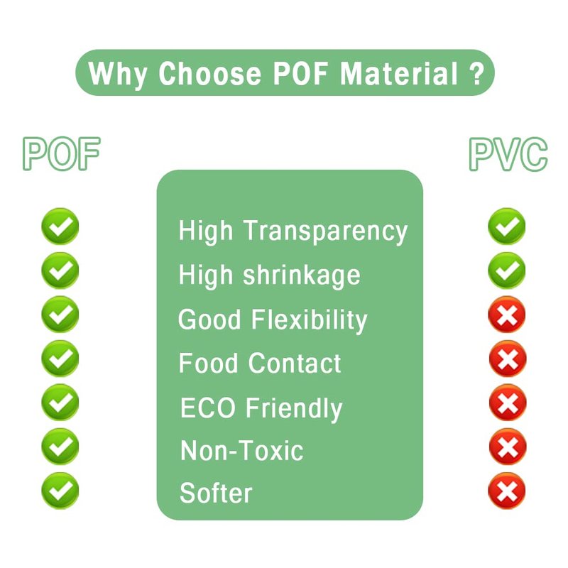 Feelers shrink wrap bags are made of high quality POF material. This POF heat shrinkable bag has no smell when shrinking with a heat gun, unlike PVC heat shrinkable bags, there is a pungent smell when shrinking.