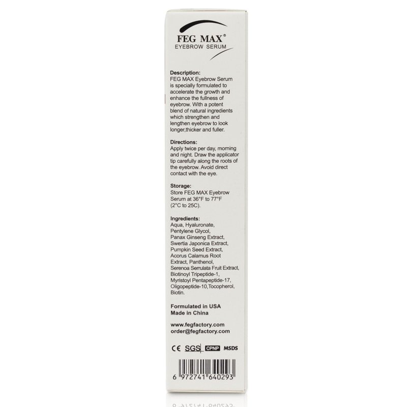 No more fretting over thin eyebrows! The FEG Max Eyebrow Serum is specially formulated to help you grow longer, thicker, and darker eyebrows like no other! With our strongest formula yet, the FEG Max is our best eyebrow growth serum available, helping you to feel beautiful, fresh, and new! This liquid eyebrow growth stimulator serum nourishes your brow line with protein complexes that reinforce and support a healthier looking appearance, bringing each eye's brow growth to the Max so you can be the beauty queen you know you are! With the FEG Max Eyebrow Serum, you can get seductive looking brows in just 4-6 weeks. Each 3ml bottle lasts approximately 3 months, providing plenty of brow growth and strengthening to reach exactly how full you want your eyebrows. FEG Max does not contain parabens, sulfates or chemical preservatives. This 100% natural, vegan friendly brow enhancing serum has been dermatologist reviewed and approved by the GMP, ISO, SGS, and CE. Containing no fragrances, our Max eyebrow serum is non-irritating and safe for all skin types. For the best results, use the FEG Max Eyebrow Growth Serum once per day, preferably at night before bed. Ensure skin is makeup free, clean, and dry before application. Apply evenly to entire eyebrow and avoid touching until the serum is completely dry.