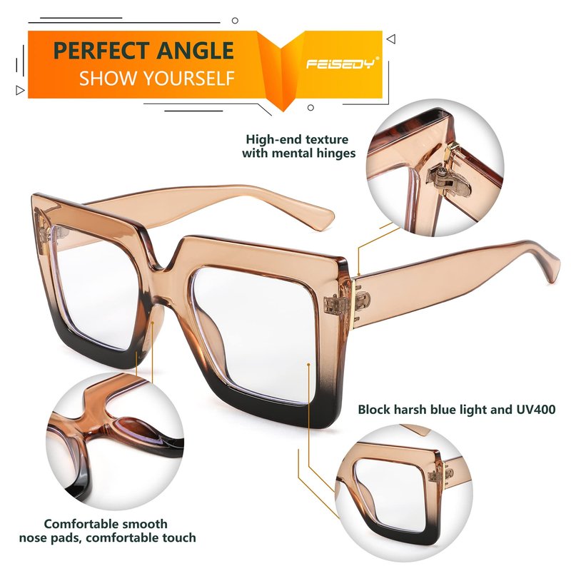 - Fashion Blue Light Blocking Glasses: Oversized trendy square glasses comes with clear lens, suitable for people who are facing mobile phones and computers for a long time. Blue light blocking lenses can reduce the harmful blue light to the eyes.