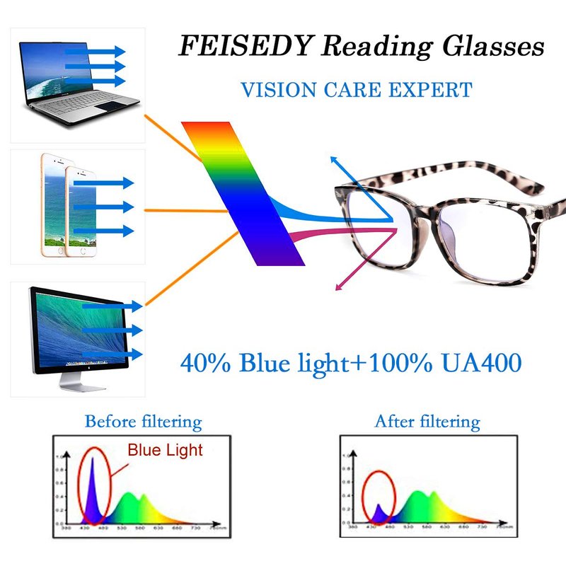 - FEISEDY Exquisite Reading Glasses Block harsh Blue Light and UV400, Designed for Busy Digital Life(computers, tablets, smart phone and so on).