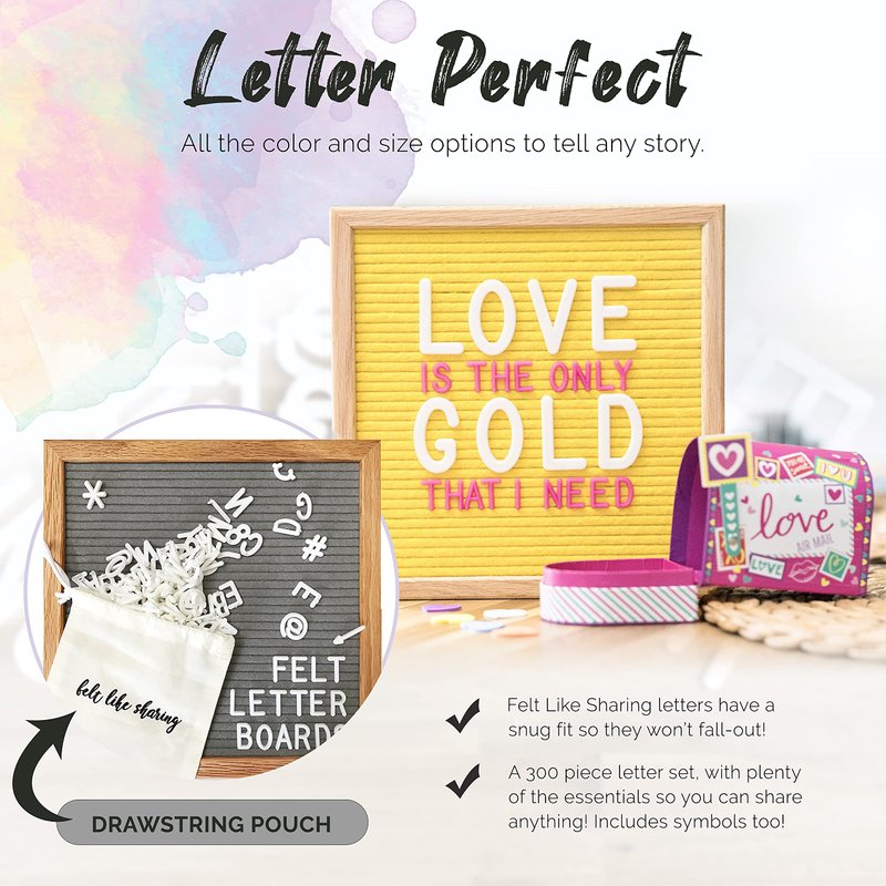 - 300 Piece Character Letterboard Letter Set. More 3/4" letters than ever and you can store them in the included Drawstring Pouch. Use the Online Editor to see if there are enough characters to write your message? You can buy an extra Pinky Promise, Bronze or Pastel letter set to really make your Bulletin Board Decor unique!