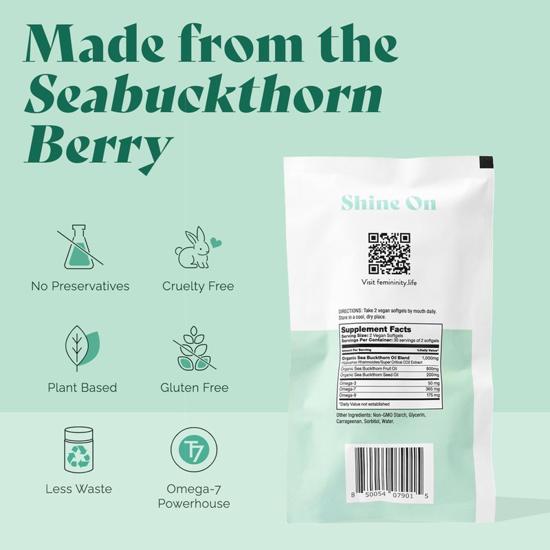 True beauty begins on the inside. With the power of our exclusive T7 Premium Himalayan Sea Buckthorn berries (aka “sea berry”) this product helps hydrate mucous membranes from the inside out, including the vaginal tissue. We've created a soft-gel dietary supplement to nourish and protect the body and promote healthy skin, hair, and nails. Sea buckthorn also benefits the digestive tract, urogenital tract, and cardiovascular system. Our T7 Turkestanica sea buckthorn is an Omega 7 fatty acid powerhouse, unmatched in its nutrient profile. Packed with over 190 bioactive compounds, it thrives in the extreme alpine environment of the Himalayan mountains to provide you with unmatched health and beauty benefits. It's made from a proprietary blend of sea buckthorn fruit and seed oil which is USDA organic, PETA certified cruelty-free and vegan, and free of preservatives, GMOs, gluten, sodium, and yeast.