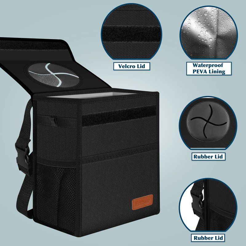 - 【THOUGHTFUL DESIGN 】Our car trash bin with soft lid that is a rubber X-shaped opening and velcro seal can be loaded with tissue paper, fruit peels, and the bottle can be closed or even cover up the waste and keep the internal smell without lifting the lid.