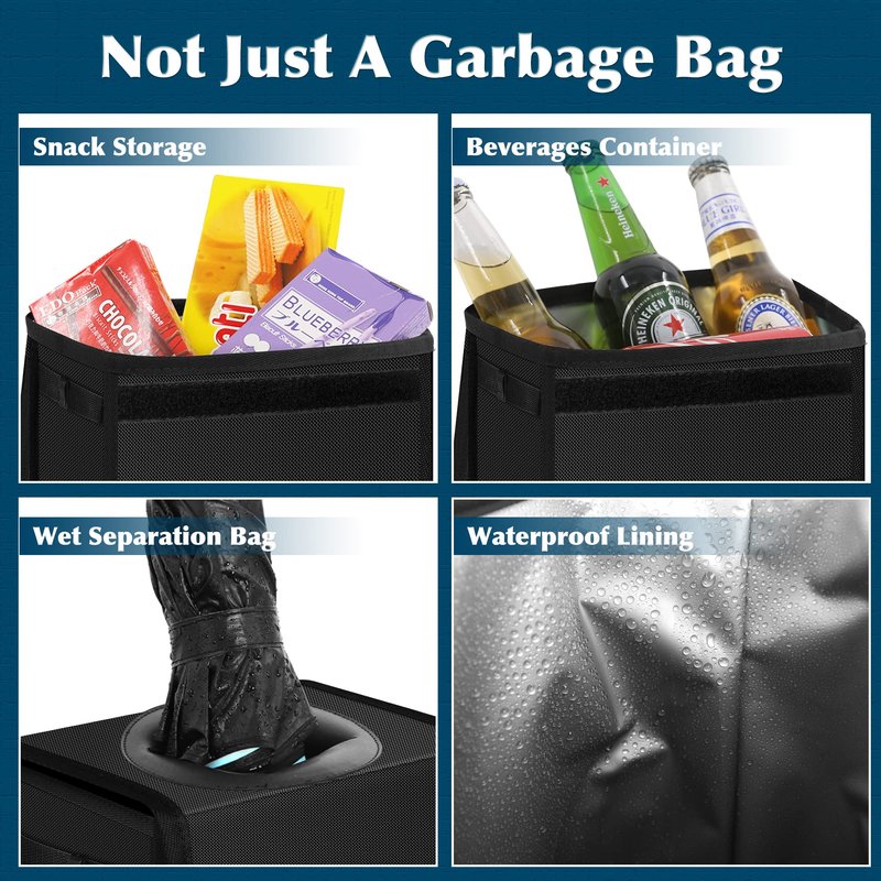 - 【MULTIPURPOSE 】PEVA lining also has the effect of thermal insulation. This car accessories not only hold garbage, but also a thermal insulation bag. You can put hot food, cold objects, fruits, drinks, snacks in it, and it can keep hot for several hours. The temperature of food and the coolness of drinks can also be used as a storage bag for other small items such as paper towels, toys, bags, snacks, umbrellas and other things you want to pack.