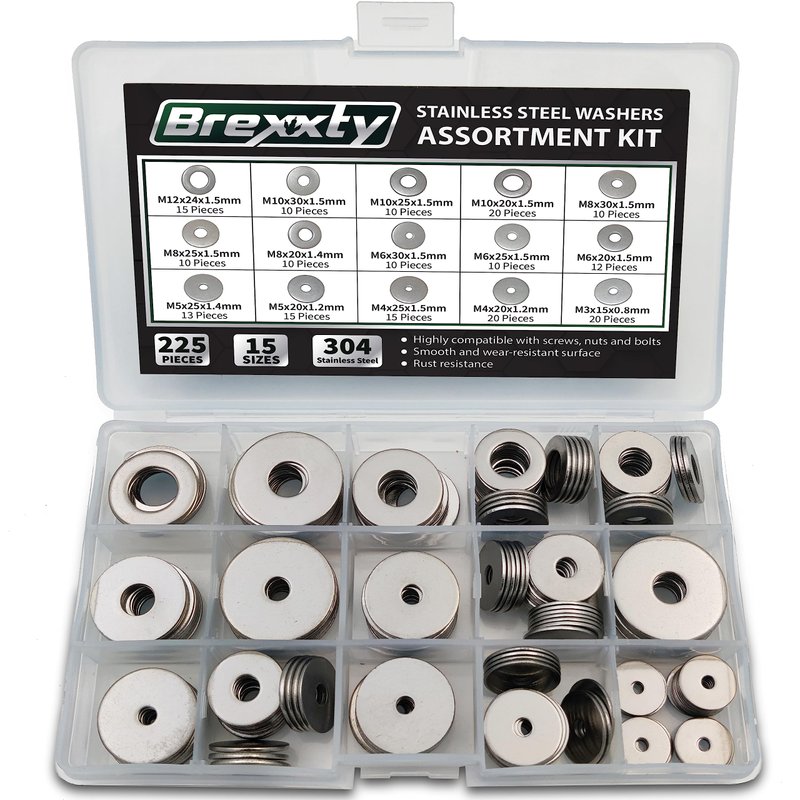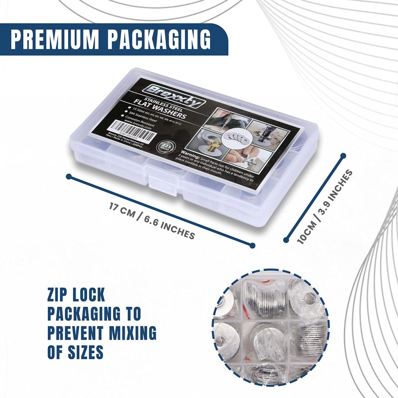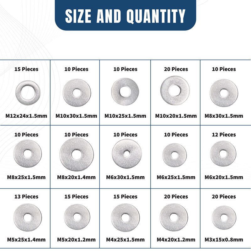 - QUANTITY: Washers for bolts come in 15 sizes and 225 pieces overall, & each stainless-steel finish washers have a different purpose, and all products require different sizes of the washer. It comes with zip lock to prevent mixing up the sizes in a transparent box