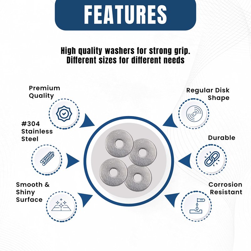 - MATERIAL: Assorted washers are manufactured with 304 stainless steel, washer set has the benefits of corrosion resistance, and good wear resistance, and a high level of hardness, which can ensure durability, even in worst weather conditions like rain, humidity, and high temperature