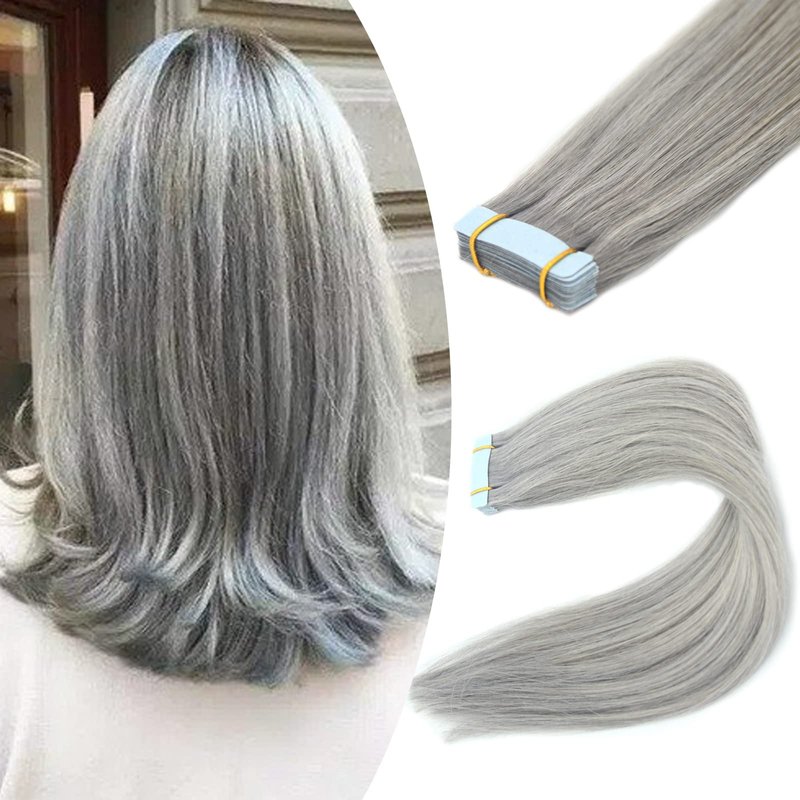 Fenicy Gray Hair Extensions Tape in Human Hair Real Hair Silver Gray Seamless Skin Wefts Tape-on Remy Hair Extensions Light Grey Invisible Double Sided Adhesive Tape-ins Hair 16inch 10Pcs/Pack
