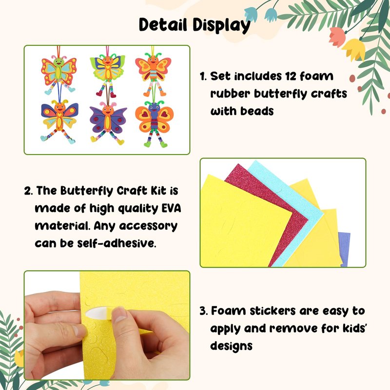 • Simple to Make:The butterfly crafts kits for kids is easy to make, you just need to tear off the sticker accessories, paste them on the template according to the shape of the butterfly then use colorful beads create the butterfly's antennae and legs .No glue required, it is simple to make to kids or students will be glad to receive these funny craft kits,these butterflies are a must-have addition to kids’ spring crafts