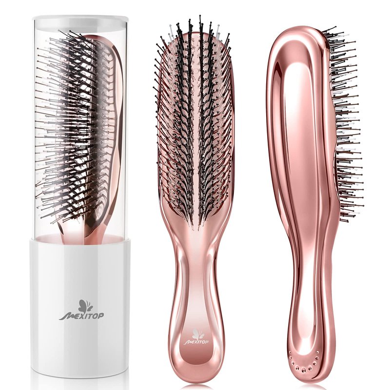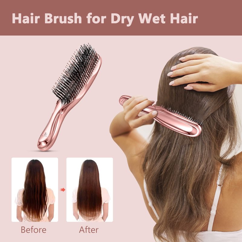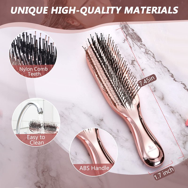 - Comfortable & Ergonomic Handle: The detangling brush has a shiny and silky Handle. The easy-to-use handle ensures it will as a Unique gift for your wife, mom, and women friend. Suitable for Valentine's day, women's day and so on. This stylish brush will be the perfect addition to any vanity. Color of Elegant and Unique - Rose Gold, Purple.